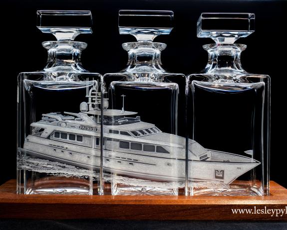I sandblasted and hand engraved this yacht across 3 Atlantis Crystal decanters.