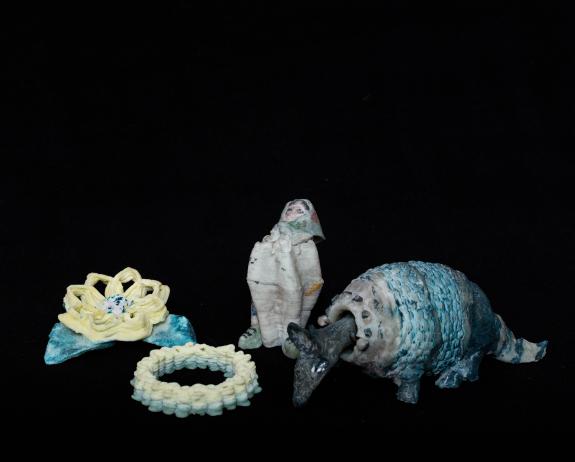 Ring, blossom, body of matrioschka, bands of armadillo printed, rest modelled.