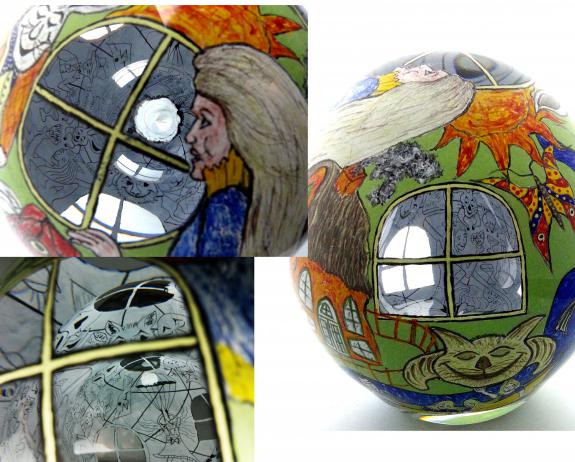 Alice in Wonderland/Through the Looking Glass.Blown sphere, cut off bubble, hand painted.