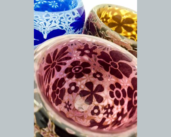 In the ariel technique, a colored layer of glass is encased by a clear layer. Onto this “blank” a design is applied by sandblasting. This is then encased in clear glass and it is heated again and blown into its final form and size. While encasing colored glass that was engraved, air bubbles trapped in the recesses of the design remain.