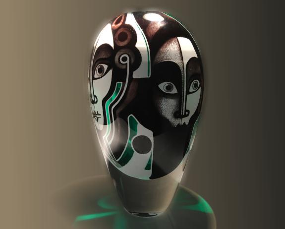 External colour imagery brush painted, internal imagery black & white sgraffito viewed through multiple 'windows', clear cased.
