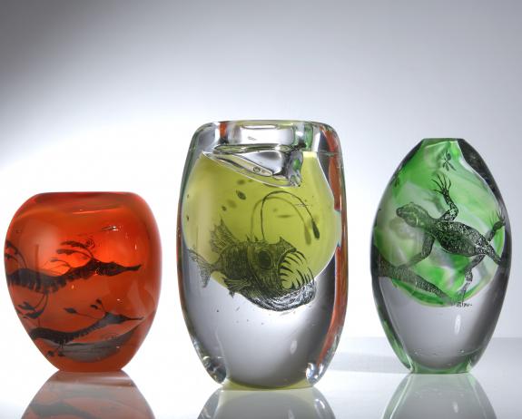 Details: Painted graal Three vessels, painted by Margaret Foster, blown by d.c glass art. Angler fish, ht 21cms Lizards, ht 19cms Sea dragons, ht 15cms