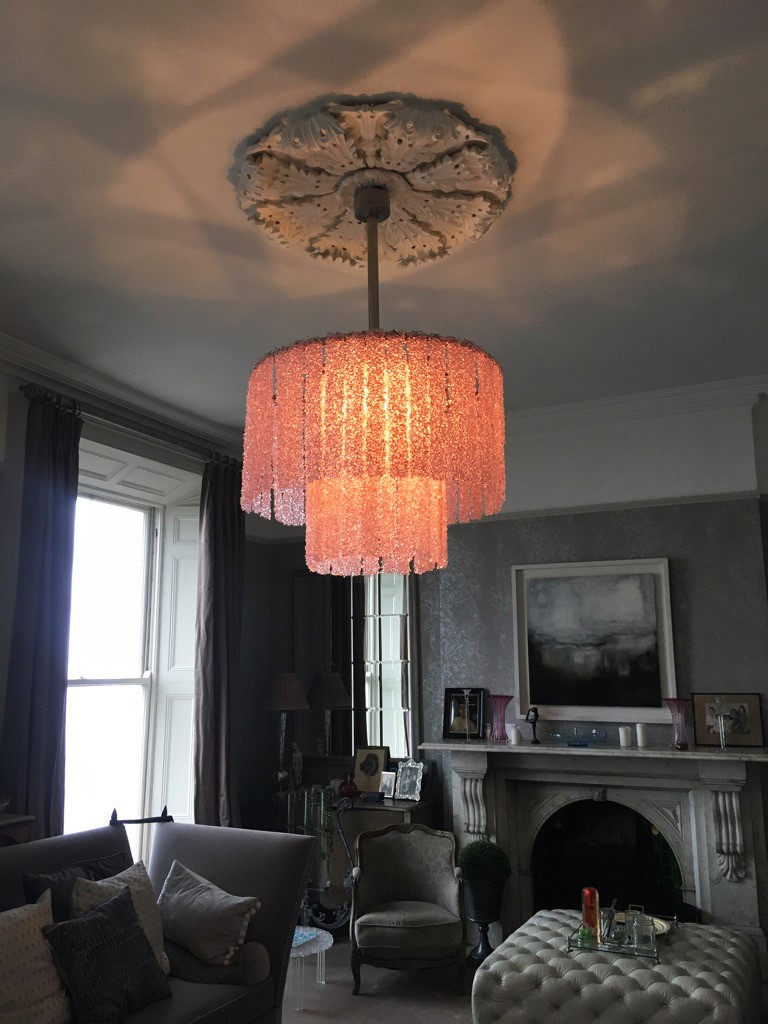 This chandelier is made from metal and glass, each strip individually made - it sits 90cm diameter.