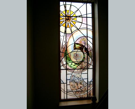 Details: Large stained, fused, painted and lustred glass leaded window.