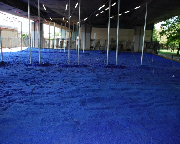 BLUE GLASSSCAPE. 28 X 32 METERS OF 32 TONNES OF RECYCLED GLASS. INSPIRED BY THE LOCAL
