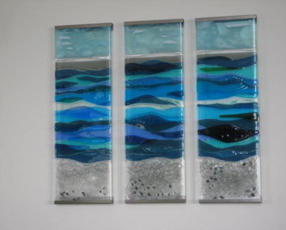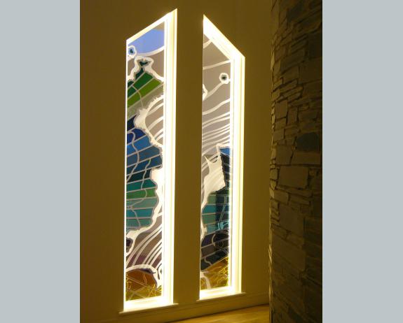 Details: Toughened and kilnformed glass panels with sandblasted detail. 3M (h) x 0.5M (w) each panel.