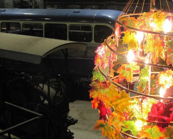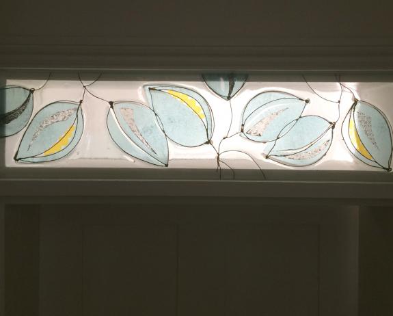 Fused glass panels with an oak leaf motif emblematic of the native trees in the
