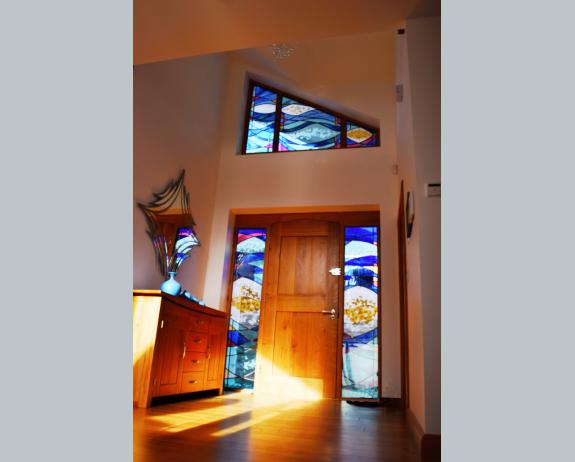 The commission was undertaken for a private new build house in Swansea. The Client requested the theme of butterflies. The glass was worked by sandblasting and silver stain. The majority of the glass is English Antique, chosen for its rich colouring and irregular surface thus creating interesting light play. Lambert’s glass makes up about 20% of the Windows. The Windows are situated above and to each side of the main front door to the house, facing a boundary wall hence the choice of colours. The work is double glazed.