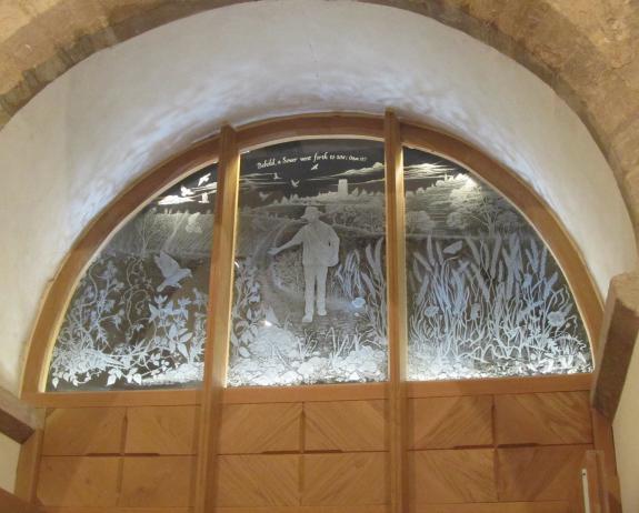 The brief was to use imagery to tell the story of the Parable of the Sower with the actual church engraved in the background. The Sower was to be enigmatic as He is often depicted as Christ himself. The design needed to give privacy to the upper room above a new vestry so had to cover a lot of glass. The LED lighting helps with privacy and enhances the 3D effects of the quite deep intaglio engraving.
