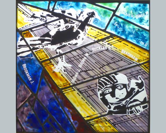 This sample was made for the 2016 Stevens Competition. The window at St Mary's Southampton is designed to be a memorial to the 550 southampton crew lost in the Titanic Disaster. All 550 names appear in the design. The bird and the man are symbols of hope, and loss, and are shown on one of the lifeboats. The lifeboat design is taken directly from the original blueprint for the Titanic lifeboats.