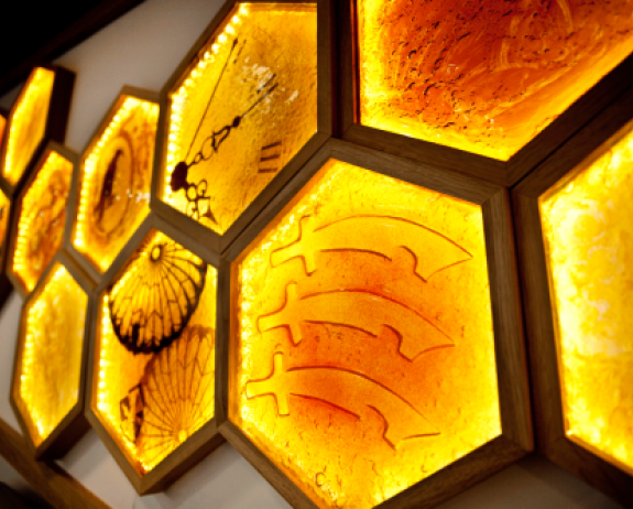 Commission for radiotherapy department, 2 murals and signage, The imagery within the light box honeycomb cells on the entranceway describes the local history and culture of the Colchester in a timeline, the second mural describes the nature and wildlife of the surrounding area. Materials used: up-cycled float glass , oak frames and led lights.
