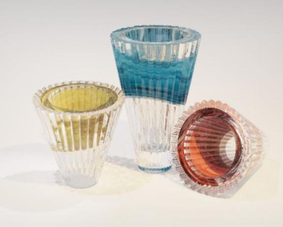 “Though this collection is currently digital, it reflects my love for the hot shop and desire to learn and develop techniques. With an aim to enjoy myself, I pulled coloured glass like taffy which is added as a trail. These pieces are thick-walled to allow the detailed colour to ‘dance’.”