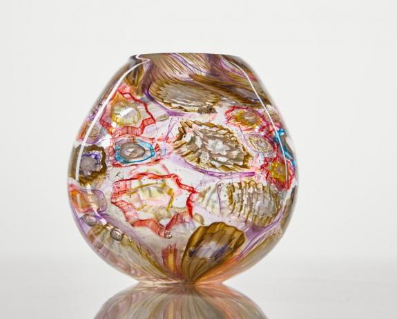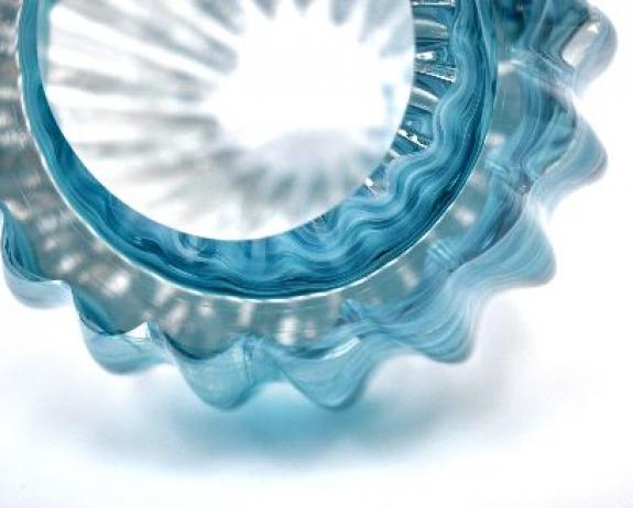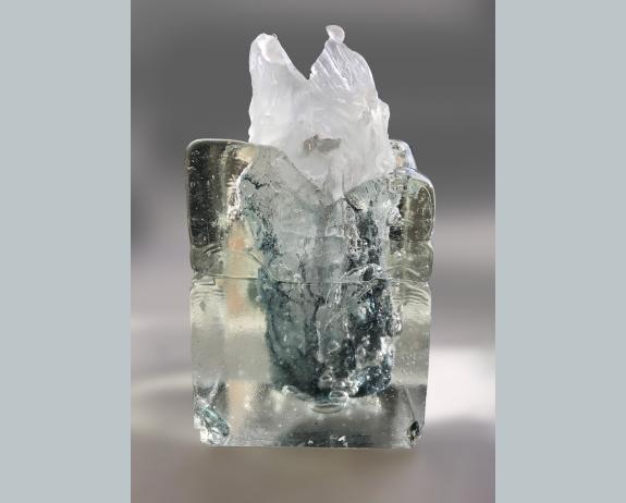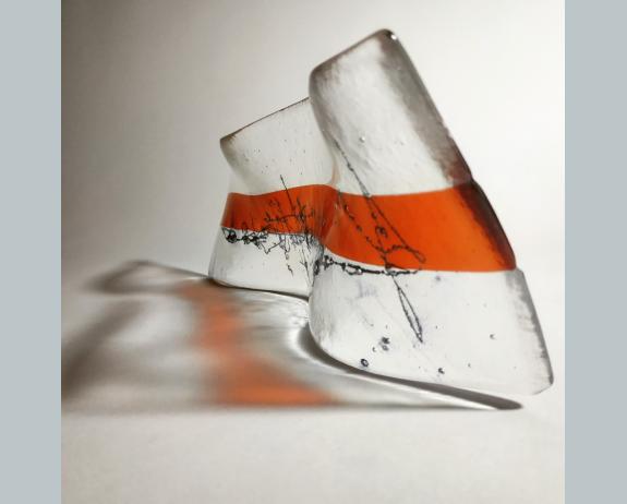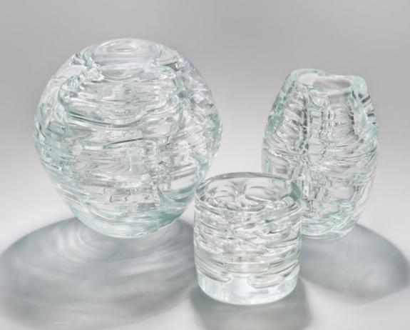 "Heidi is inspired by the immense power of geological forces and the beauty of their effect on the landscape. She specialises in combining hot glass casting with kiln-casting and glassblowing techniques. Her current work involves plunging vessels into molten glass, simulating the violence of the geological forces which inspire her."