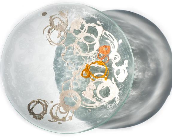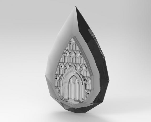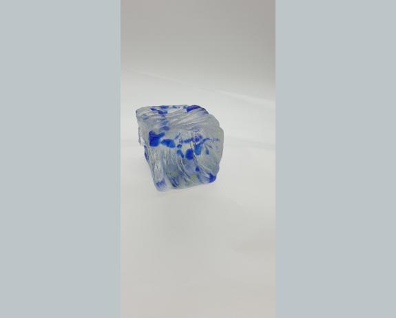 Layered low iron float glass exploiting a combination of oxide reactions and decals, 70 x 90 x 22 mm.
