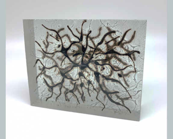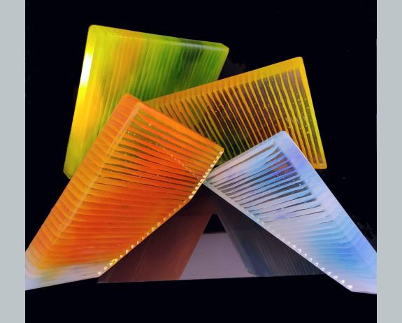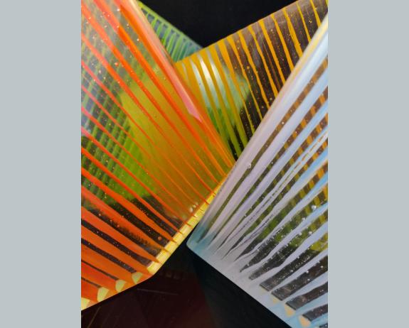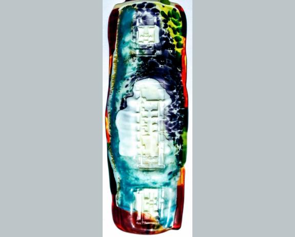 "Inconsequential, explores possibilities of layering and colour, using glass and mixed media. The conceptual aspect of my practice involves the investigation of discarded, inconsequential things. This body of work involves the exploration of pattern and designs based on discarded sprue sets from airfix modelling kits retrieved from the bin. "