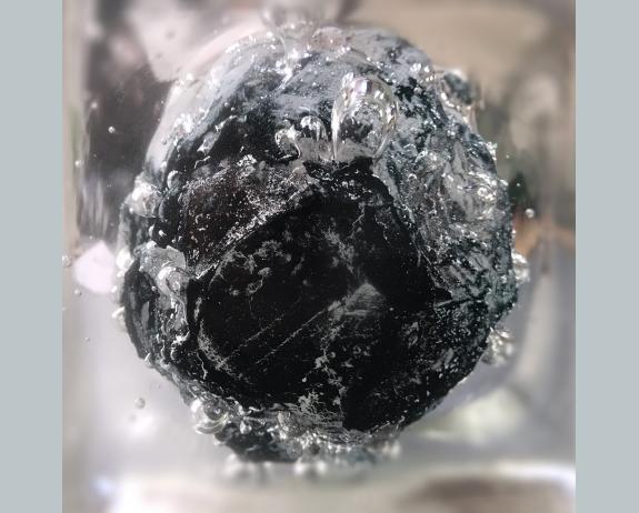 Speleogenesis III, 2020. Ladle-cast glass with kiln-cast inclusion, decorated with metals and oxides. 14cm x 15cm x 15cm.