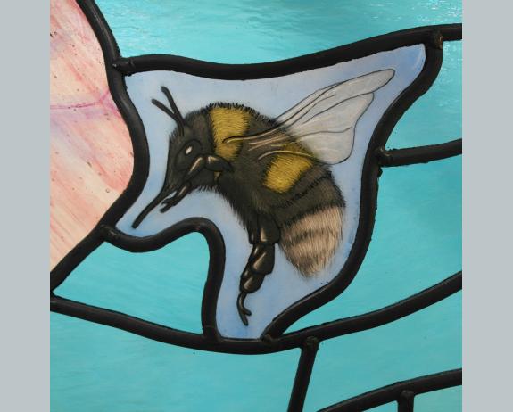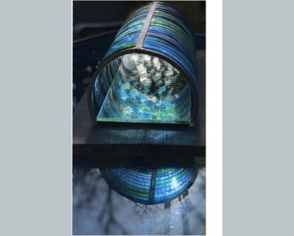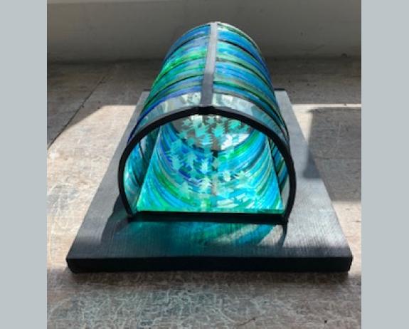 This is an architectural stained glass with a sandblasted mirror representing a sea tunnel with light at its end hoping we might fight to prevent the damage to sea lives and ultimately ourselves.