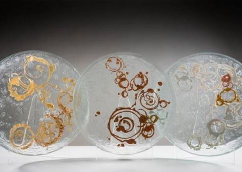 Triptych of 400mm, 55mm deep glass bowls. 6mm float with Gold, Copper and Silver Mica.