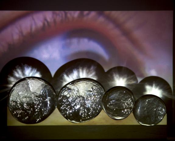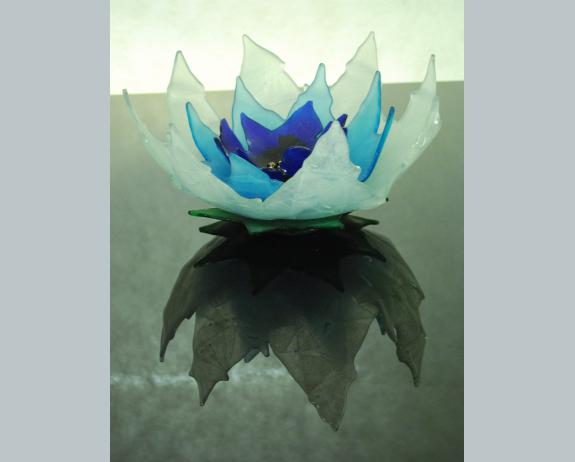 Details: Mould blown glass, cut and polished, and UV mounted on float glass.