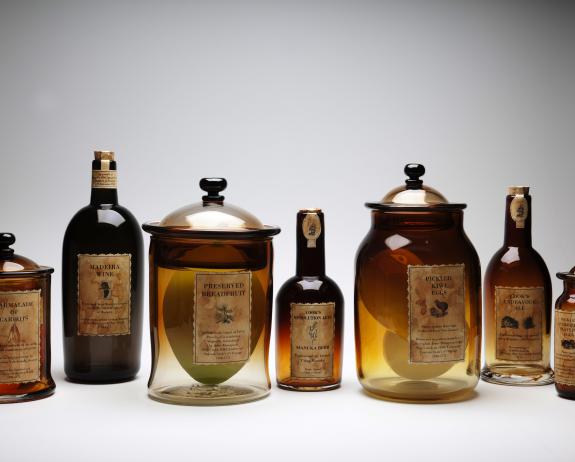 Details: Free blown glass containers, solid formed and blown glass inclusions, printed and distressed paper labels H40xW100xD15cm group