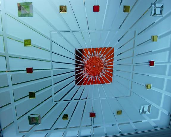 Sandblast sun rays on 3 faces within the triple glazed unit, sandblast sun rays on orange flashed glass, fused orange and yellow pieces and clear glass bevels bonded within the unit.
