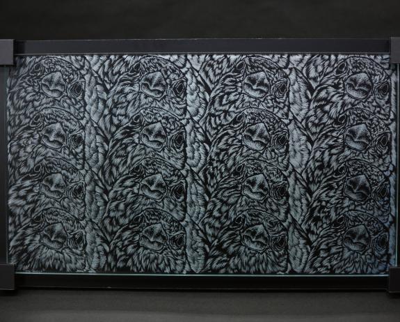 Details: Drill engraved on sheet glass in hand made frame. 42cm long x 26cm tall