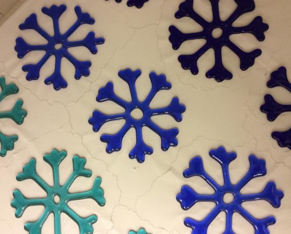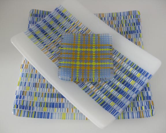 Fused sheet glass and stringers, cut up and arranged in patterns, fused again, then slumped