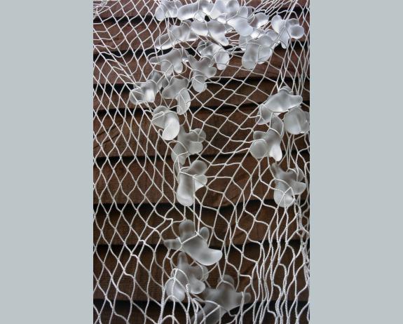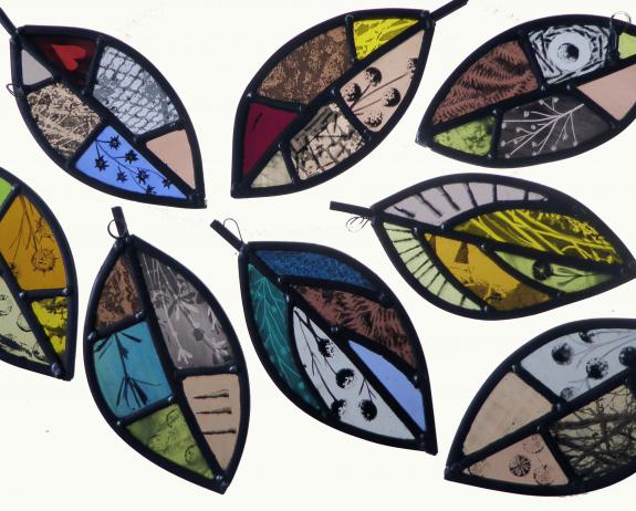 Details: Moulded from real leaves, a collection of Bullseye Frit sculptures.