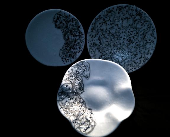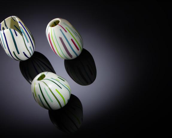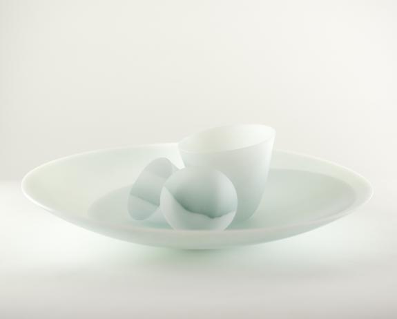 Three vessels using dense white and french white Bullseye Glass to utilise their reactive properties.