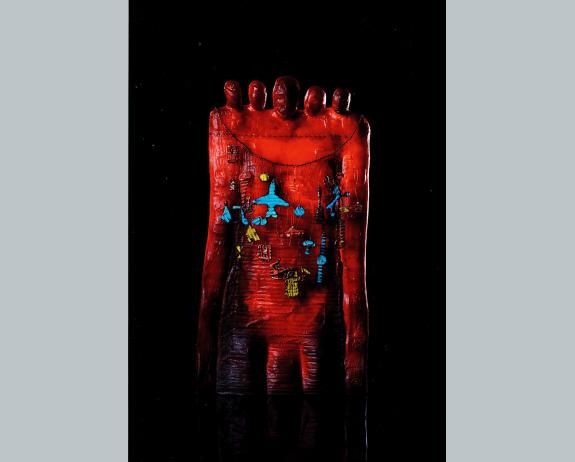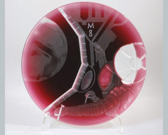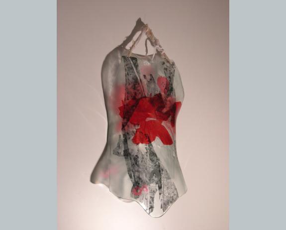 One of a series of breast plates using kiln-formed float glass with copper stain and decals, acid-etched and cold worked.