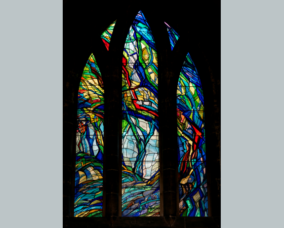 The Tree growing from the stump (Jesse) is the Israelite nation and includes the green shoot or ‘rod’, the line of Christ. The tree grows up and across, filling the window with lush growth. Red represents the redeeming sacrifice of Christ. It represents God reaching down to mankind and making a way for us to know Him, whoever we are and wherever we come from. This makes it possible for other ‘trees’, which are not descended from Israel, to reach up and become grafted into the whole.