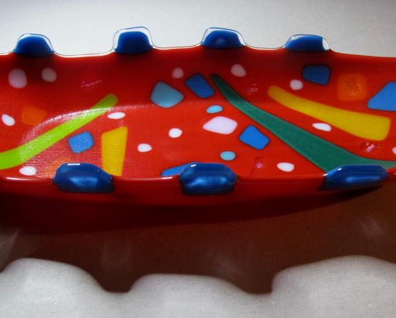 Details: Fused glass dish (Bullseye), approx 12"" long x 2" deep