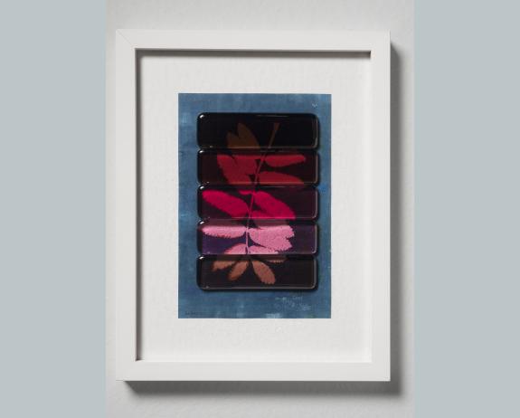 Details: Mixed Media, Fused Glass over negative mono-print of Rowan leaves. 37 x 28 cms