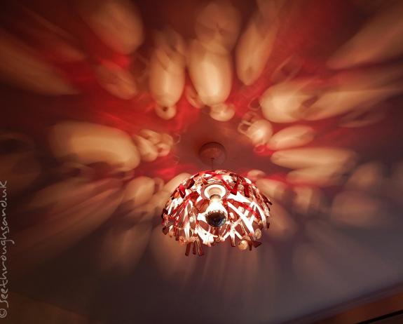 Lightshade constructed using various transparent red glasses. Light reflects back through the shade onto the ceiling above to represent a fiery sunset sky.