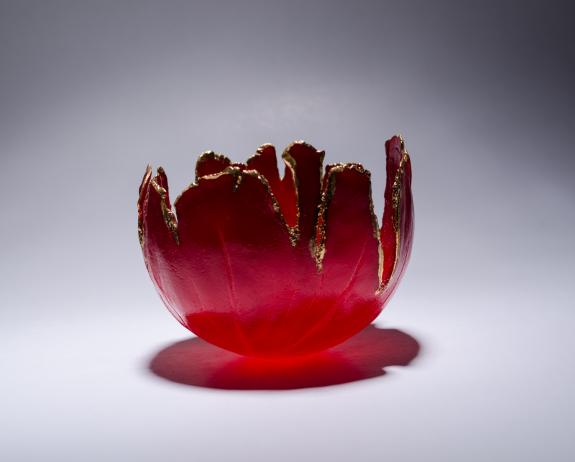 I made this red vessel experimenting with the pâte de verre technique. I do not use a mold, I model the paste of glass. In a second fire I gave it the details with liquid gold. Nature always inspires me with its round forms and in this case, with an extraordinary colour.