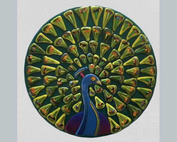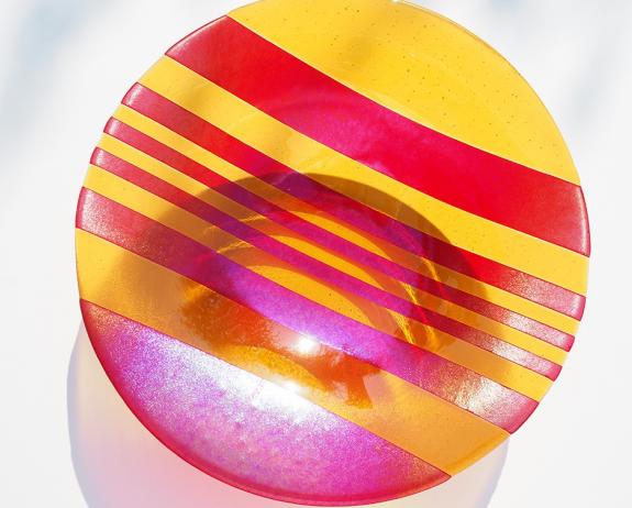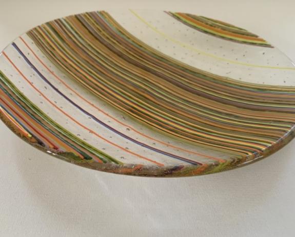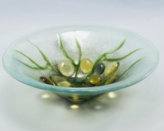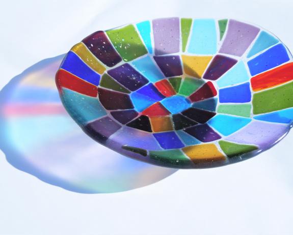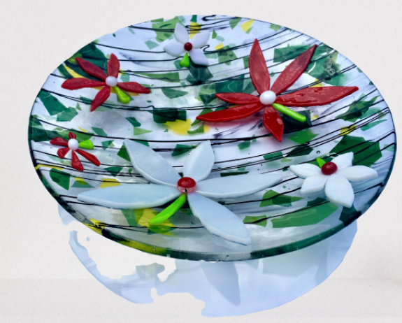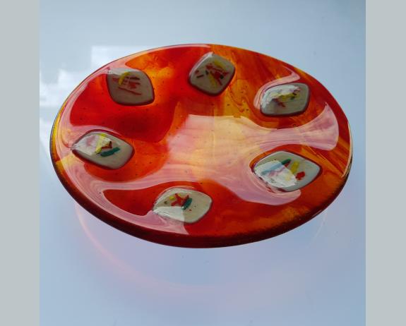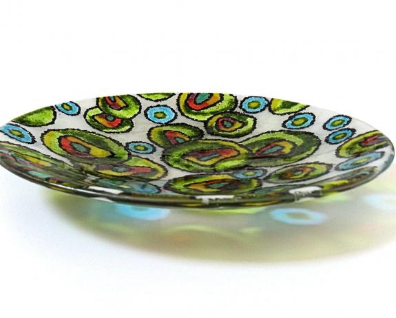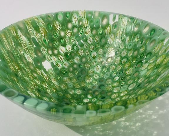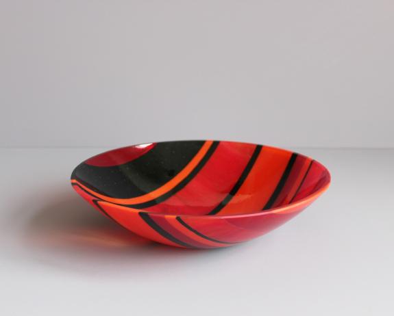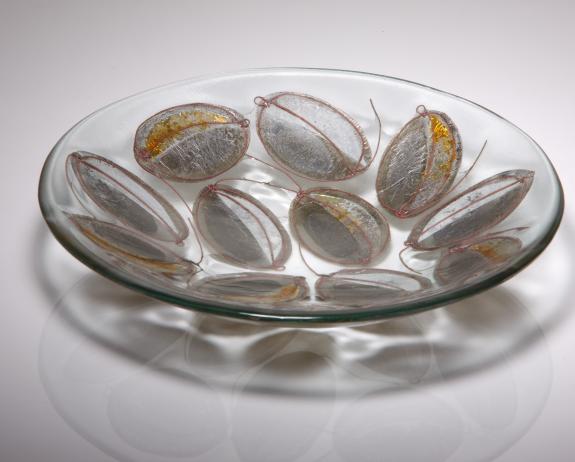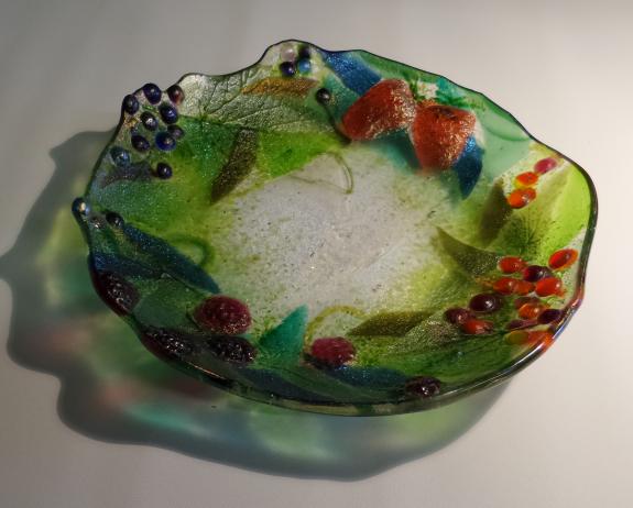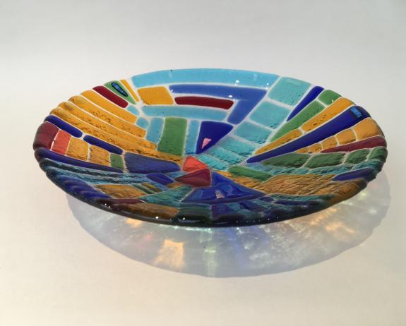 Details: Fused glass bowl: Media: Handmade glass fusions and miurrini. Dimensions: 38 cm diameter