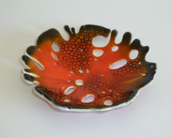 I wanted to try something different and thought a ‘coral’ type bowl looked fun. I was right, I had great fun creating this bowl using mainly offcuts and oddments. The process of sifting powders, blending colours and creating patterns was vary therapeutic. I used Bullseye glass French Vanilla, Cream and Dense White for the framework and Pimento Red, Burnt Orange and Black for the decoration.