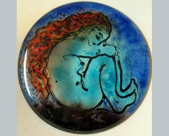The image,taken from one of my life drawings,drawn with glass pen lines onto two circles of glass,fused and slumped to a gentle bowl with aqua and blue and red powders and frits seemed to be relevant today as it depicts a young girl in isolation holding it altogether -keeping calm -waiting for the isolation to end.