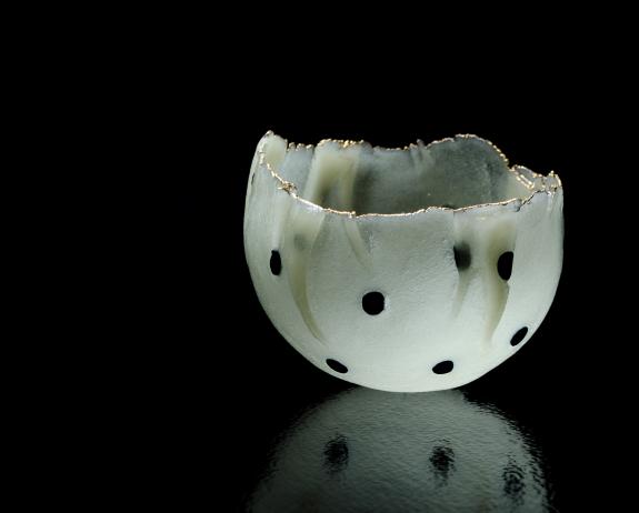 Details: Fused and slumped bowl with freeze fused details. 18cms dia. £65.00