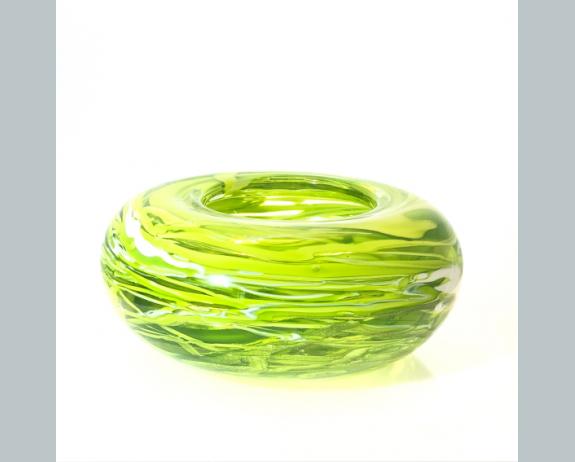 Hot hand blown clear glass wrapped with a two-tone trail - translucent lime green over opaque white - encased in more clear then another trail then anot