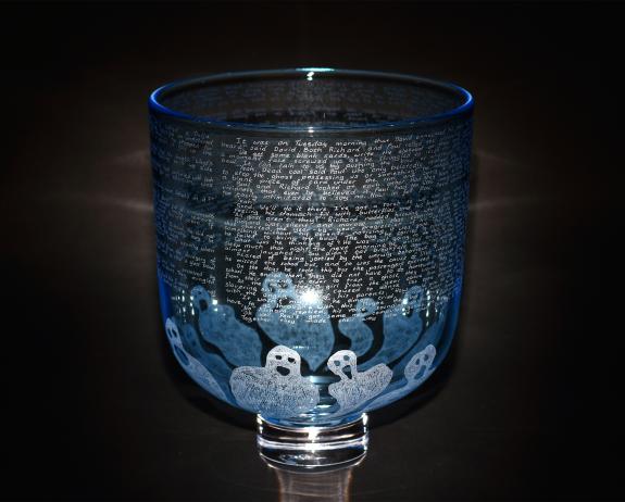 Details: Hand blown bowl with original story by written and engraved by Dominic Fonde