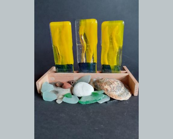 I'm Inspired by my love of the sea and beaches.The yellow sunny glass with golden rivulets