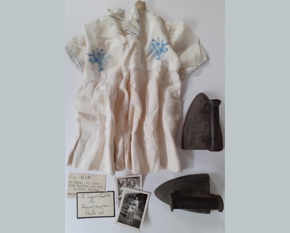 I have been inspired by possessions left by my english grandmother Eva. During the Blitz in 1941, my two aunts aged five and ten years old were killed during enemy action. Luckily my grandmother and father survived. Very few items were saved from the house, a baby's dress, two irons and with these I have included photographs and condolence cards. These everyday objects tell a personal story and have led me to explore my famil